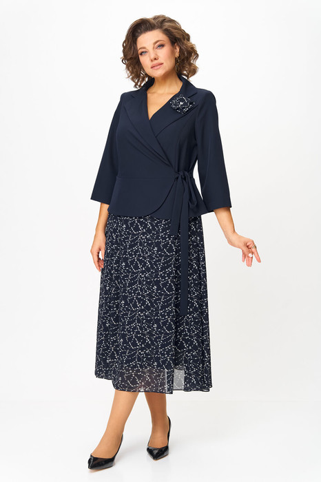 Лиф из плательной ткани, юбка из шифона. Платье с запахом, горловина с воротником пиджачного типа с отложными лацканами. Рукава втачные, длина 3/4.