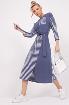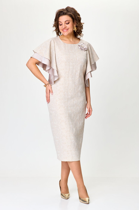Платье прилегающего силуэта с застежкой на молнию в центральном шве спинки, горловина круглая. Украшением платья служат рукава, выполненные в виде волана, из двух видов ткани.