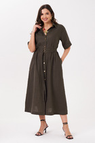 Платье шифоновое А-силуэта, отрезное по линии талии с рюшей. Втачной длинный рукав со сборкой по окату и внизу на резинке. По переду лиф с центральной застежкой на петли-пуговицы. Полочка и спинка с притачными слегка присборенным воланом с рюшей из основной ткани и воланом из отделочной ткани с пришитым к нему кружевом по низу платья. Воротник стойка с рюшей. Платье на подкладке.