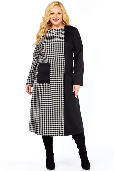 Геометрия стиля: Оригинальный дизайн с геометрическим разделением на черно-белую "гусиную лапку" и глубокий черный цвет – это игра контрастов, которая привлекает внимание и подчеркивает вашу индивидуальность. Вертикальные линии визуально стройнят фигуру, а продуманный крой обеспечивает идеальную посадку.