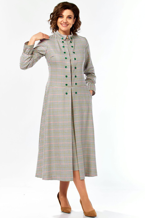 •  Застежка: Особое внимание привлекает центральная застежка с декоративными пуговицами (оттенок пуговиц может незначительно отличаться от представленного на фото). Они расположены в два ряда, создавая эффект элегантной «двубортности» в верхней части и становясь главным цветовым акцентом платья.