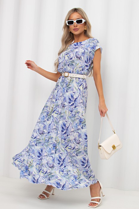 Воздушное платье полуприлегающего силуэта с цветочным принтом. Короткие спущенные рукава. Горловина на внутренней обтачке оформлена "лодочкой". Модель отрезная по талии, собрана на резинку. Низ ровный, без разрезов.