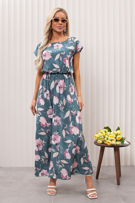 Воздушное платье полуприлегающего силуэта с цветочным принтом. Короткие спущенные рукава. Горловина на внутренней обтачке оформлена "лодочкой". Модель отрезная по талии, собрана на резинку. Низ ровный, без разрезов.