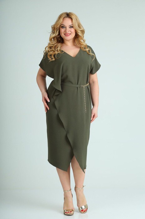 Платье женское полуприлегающего силуэта. Линия плеча спущена. По спинке средний шов. Перед из двух деталей, верхняя деталь отлетная, фиксируется съёмным поясом. V-образный вырез горловины. Обработка деталей переда, проймы, низа изделия - окантовкой.