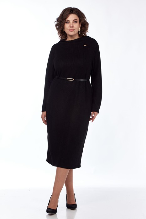 Платье женское, полуприлегающего силуэта, по спинке средний шов, заканчивающийся внизу разрезом. Пройма квадратная, рукав втачно одношовный, зауженный к низу. Воротник- цельнокроенная стойка с расширенной горловиной. В качестве отделки используется фурнитура и съемный пояс.
