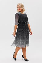 Платье женское полуприлегающего силуэта со спущенной линией плеча. По переду нагрудные вытачки. По спинке средний шов, в боковых швах обработаны карманы, по низу разрезы. Вырез горловины Г-обрагный с довязом. По низу рукава довяз.СУМКА В КОМПЛЕКТЕ НЕ ИДЕТ.