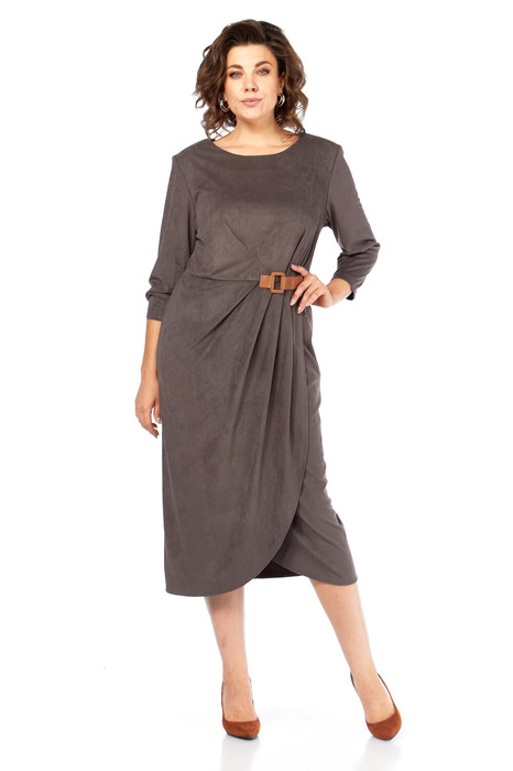 Платье женское полуприлегающего силуэта. Спинка со средним швом. Перед отрезной по линии талии. Верхняя часть с 2-мя мягкими складками, нижняя часть с запахом и 4-мя мягкими складками. Полы запаха округлой формы. В области складок декор-пряжка. Горловина круглая, сзади застегивается на петлю и пуговицу. Рукав втачной, одношовный с локтевой вытачкой. Фурнитура может отличаться от заявленной на фото.