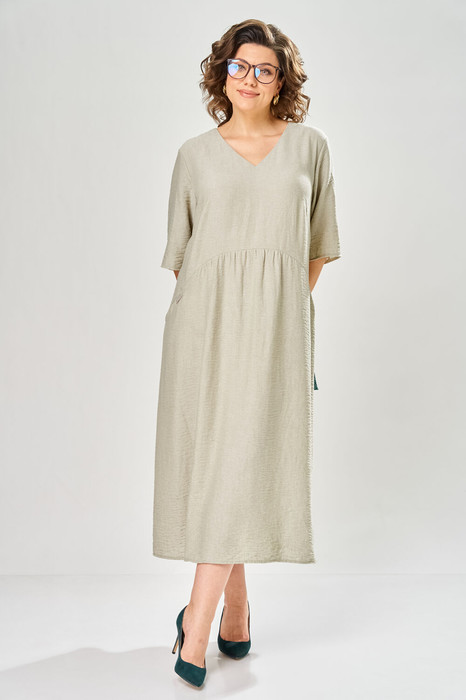 Платье женское свободного кроя . Спинка со средним швом и полукруглым подрезом в области талии. Перед с V-образной горловиной и полукруглым подрезом в области талии. В нижней части переда и спинки сборка в центральной части . Боковые карманы обработаны в шве подреза переда. Правый карман украшен нашивкой. Рукав втачной одношовный длиной до локтя. Фурнитура может отличаться от заявленной на фото.