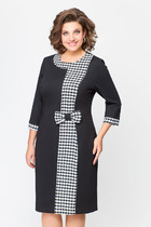 Платье из костюмно-плательной ткани прилегающего силуэта. Отрезное по линии талии с ассиметричной линией низа. Дополнено элементами из мягкой сетки (по правой стороне юбки и правого плеча). В левом боковом шве обработана потайная молния, бретеля на левом плече регулируемая.