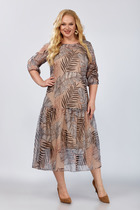 Полуприлегающее нарядное платье с веерообразными складками от линии бочка переда и воротником стойкой.