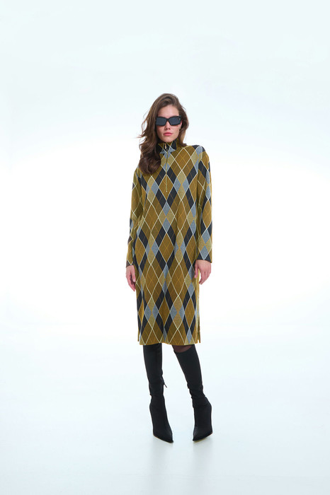 Платье женское, прямого силуэта, длиной ниже колена. В нижней части боковых швов разрезы. По переду застежка на молнию. В боковых швах карманы. Рукав длинный. Воротник стойка