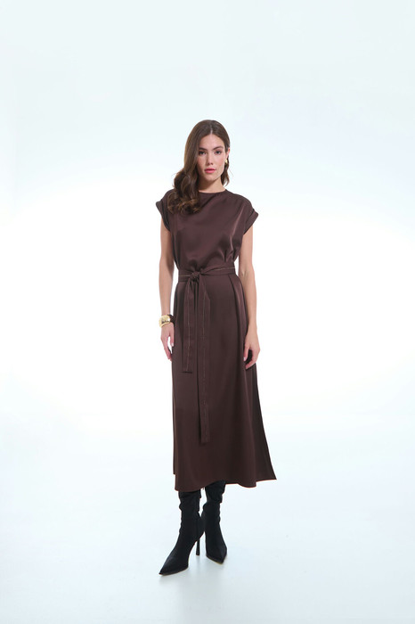 Платье женское свободного кроя. Рукава цельнокроеные с притачной манжетой. Горловина окантована косой бейкой. В комплекте съемный пояс
