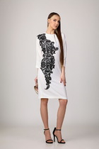 Платье женские А-образного силуэта с втачным одношевным длинным рукавом и воланом на резинке. Спинка со средним швом и декоративнымискладками, застроченными в верхней части. Перед с отрезной кокеткой-погон. Вырез горловины Y-образный с декоративной фигурной планкой с завязкой, перед со средним швом, декоративными складками по бокам так же застроченны сверху. В боковых швах карманы. Низ платья с притачной планкой и контрастной нашивкой.
