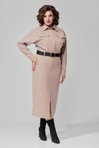 Платье выполнено из льна. Платье отрезное по линии талии, длиной выше линии колен. Лиф двойной: нижний покрывает туловище, верхний - покроя "летучая мышь". Задняя часть юбки на кокетке, центральная часть которой собрана на венгерку. Пояс вставлен в боковые швы с бантом по переду.