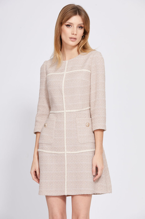 Платье выполнено из твида.  Платье Х-образного силуэта, отрезное по линии талии, длиной выше линии колена. Застежка на потайную молнию в среднем шве спинки. Горловина округлой формы. Рукав втачного покроя, одношовный, длиной 3/4. Юбка расширена к низу. По переду два кармана с пуговицами. Заднее полотнище со средним швом. Платье на отлетной по низу подкладке. Платье декорировано тесьмой.