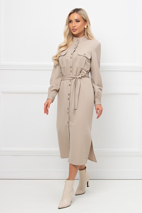 Стильное платье - рубашка прямого кроя. Горловина оформлена воротником - стойкой. По переду застежка на петли и пуговицы. Перед дополнен накладными карманами со складкой и клапаном. Длинный втачной рукав оканчивается притачной манжетой. Низ прямой, по бокам разрезы. Пояс из основного материала входит в комплект.