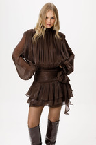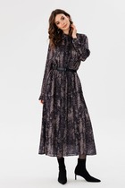Платье – рубашка, выполнено из сочетания однотекстурных тканей- компаньонов. Горловина- округлая. Рукав втачной, низ рукава обработан декоративной манжетой. По переду расположены прорезные карманы- рамки. Низ- фигурный. длина изделия по центральному шву спинки 124. Длина рукава 42. Длина изделия по боковому шву до выреза (разреза) 75