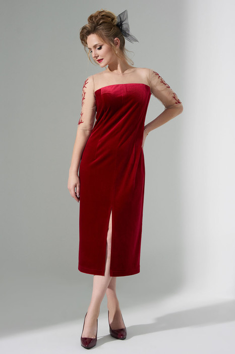 Платье женское  выполнено из велюра и прозрачной сетки. Изделие прилегающего силуэта. По горловине выполнен вырез со вставкой из сетки . На сетке по рукавам - вышивка. Рукав втачной длинный, зауженный к низу. По низу изделия  длинный разрез 40см.