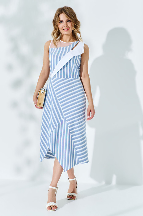 Платье женское приталенного кроя, отрезное по линии талии. Горловина округлая с вставкой из полупрозрачной сетки. Изделие без рукавов. По полочке изделия в линии груди расположен декоративный лацкан и вырез. Низ изделия -фигурный. По спинке изделия расположена полупрозрачная кокетка с вырезом-капелька и застежкой на пуговицу.