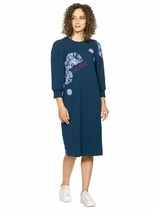 Платье вечернее длинное выполнено из сочетания сатиновой ткани с приглушенным блеском и декоративными вставками из пайеток. Изделие отрезное по линии талии. Лиф платья свободного кроя по плечам и талии заложены глубокие складки, рукав втачной длинный, с декоративными прорезями, по низу рукава расположена узкая манжета из декоративной ткани с застежкой навесная петля-пуговица. Спинка лифа разрезная( разрез обработан закрытыми швами) застежка на горловине навесная петля-пуговица. Юбка изделия прямого кроя с высоким разрезом по переду. Застежка по спинке потайная молния.