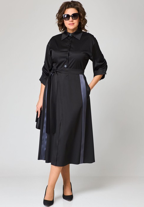 Платье женское нарядно-повседневное полуприлегающего силуэта до талии и расширенное к низу. Выполнено из плательной ткани в сочетании с отделкой. Платье отгрезное по талии. В боковых швах обработаны карманы, по переду юбки отделочные ввставки в виде вертикальных полос и центральный шов с разрезом, по спинке встречные склада. Вырез горловы воротник на стойке рубашечного типа. Застежка до талии на обментанные петли и пуговицы. Рукав втачной 7/8 по низу на притачной манжете, в рукаве отделочная пата с помощью которой можно регулировать длину рукава. Декором платья служат вставки из отделочной ткани и пуговицы.