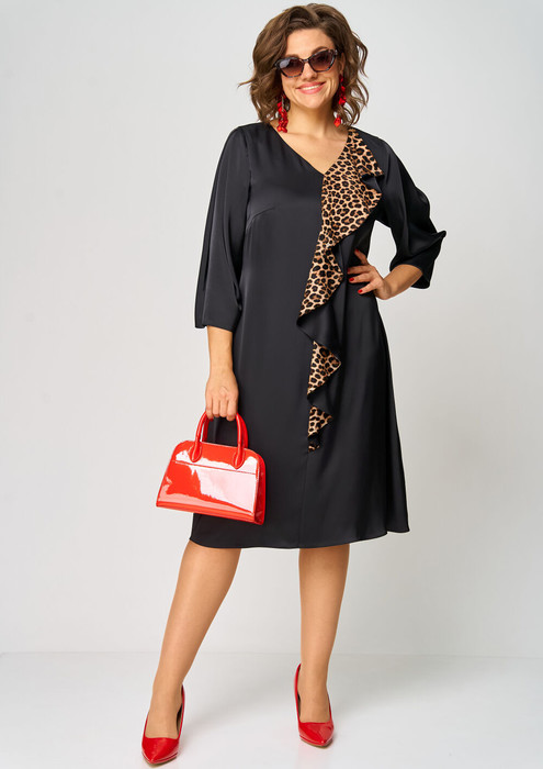 Платье женское А-образного силуэта, выполнено из плательной ткани в сочетании с отделкой. Вырез горловины V-образный обработан обтачкой. Рукав втачной 7/8, со встречной складкой по центру. От плеча по левой стороне переходящее по центру платья вставлен отделочный элемент в виде волана.