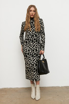 Платье шикарное женское нарядное вечернее полуприлегающего силуэта расширенное к низу, выполнено из плательного крепа в сочетании с сеткой с принтом в виде паутинки. Вырез горловины круглый на обтаке, по пинке застежка на навесную петлю и пговицу. Рукав втачной из сетки по низ собрн на резинку. Платье с фигурным подрезом по полочке, по низу притачной волан из сетки. Декором служит красивая нарядная отделочная ткань на рукавах и волане.