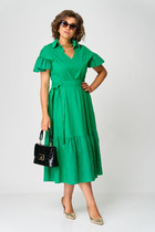 Платье женское нарядно-повседневное полуприлегающего силуэта расширенное к низу. Выполнено из хлопка в сочетании с шитьем. .Вырез горловины фигурный, воротник на стойке рубашечного типа. Рукав спущенный из отделочной ткани по низу с воланом собранным на сборку. Платье отрезное по лиии талии. Юбка ассиметричная с застежкой доверху на обметанные петли и пуговицы. По низу юбки притачной волан из отделочной ткани (шитье), в боковых швах обработаны карманы. Декором платья служит дизайн ткани,отделочные элементы из шитья. съемный пояс из основной ткани и отделочные пуговицы.
