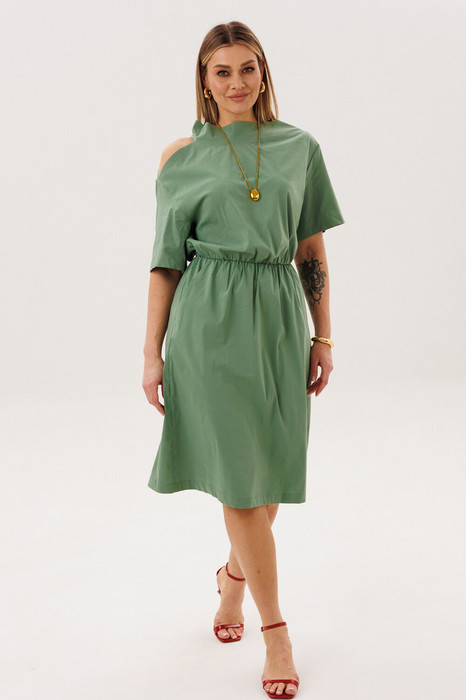 Свободный А-образный силуэт, рубашечный покрой, ассиметричная горловина, изысканный открытый участок плеча, эластичная тесьма по линии талии, съёмный пояс на полукольцах.