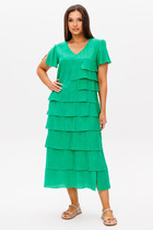 Платье с V-образным вырезом горловины, отрезное чуть выше линии талии, с коротким рукавом покроя-реглан имеет конструктивное решение в виде широких воланов с легкими сборками.