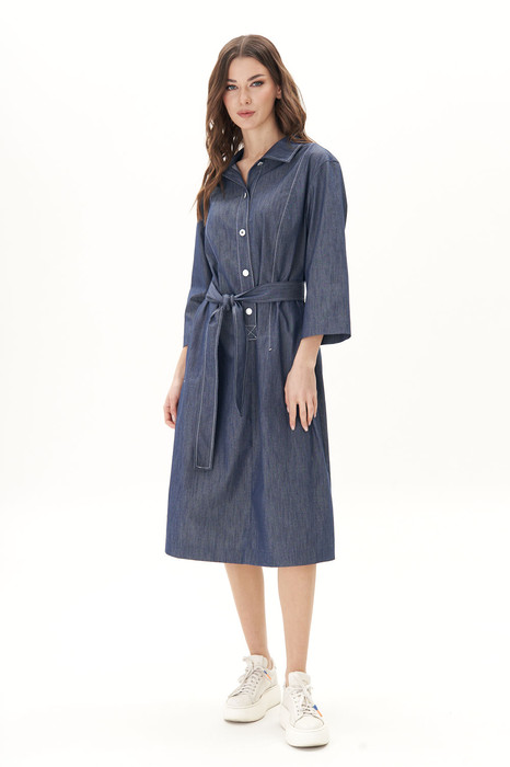 Платье, в котором можно выглядеть повседневно и празднично, игриво и элегантно, в зависимости от настроения, создавать совершенно разные, яркие, запоминающиеся образы. Платье полуприлегающего силуэта, втачного покроя, с рубашечным воротником на цельнокроеной стойке. Полочка с вертикальными рельефами и частичной застежкой на петли и пуговицы. По боковым швам - карман с листочкой. Спинка с отрезной кокеткой, срезным швом и вертикальным частичным рельефом. Модель дополнена съемным поясом. Все конструктивные элементы подчёркнуты отделочными контрастными строчками.