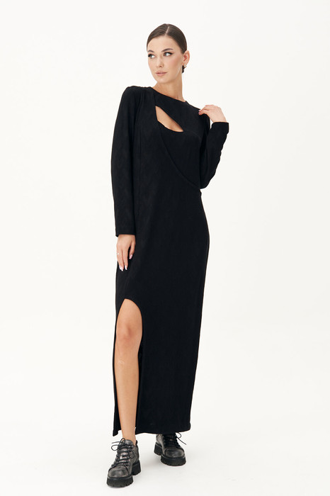Элегантное трикотажное платье полуприлегающего силуэта с трендовым разрезом - открывающим загадочно ногу, и вырезом деликатно приоткрывающий зону декольте. Ассиметричный, сложный крой модели: односторонний рельеф, оригинальный подрез и отрезная кокетка с одной стороны полочки, преображают, казалось бы простое чёрное платье в необычно актуальное.