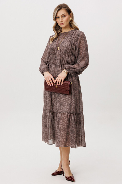 Легкое и воздушное, микс нежности и дерзости, воплощенный в комбинации противоположностей: нежного шифона и геометрического принта. А-образный силуэт, втачной рукав, со сборкой по низу, круглая горловина. Платье отрезное, чуть выше линии талии, лиф полочки с V-образным подрезом и легкой сборкой в боковой части на эластичную венгерку. Боковая часть на подкладке. Лиф спинки со средним швом и застежкой. По линии талии-эластичная тесьма.