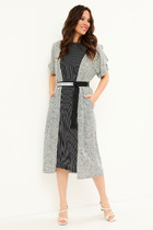 Полуприлегающий силуэт, втачной покрой, рукав длиной 7/8, отрезной лиф с запахом, юбка с запахом по переднему полотнищу. По линии талии по переду акцентная драпирующаяся деталь-перевертыш. По линии талии на спинке-эластичная тесьма.