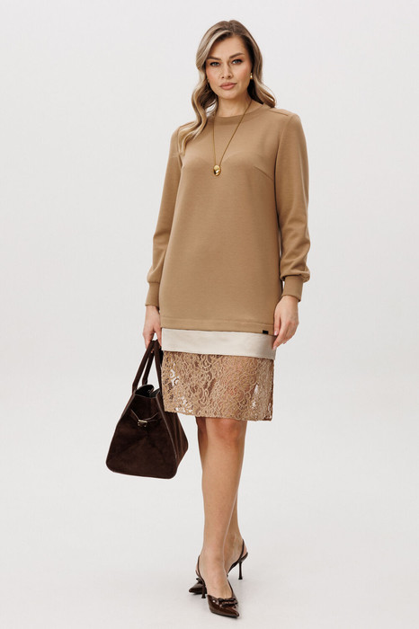 Нижняя часть платья дополнена декоративной вставкой из кружева, которая добавляет образу изящества и визуальной лёгкости. Контраст фактур создаёт эффект многослойности и делает модель выразительной без излишней декоративности.