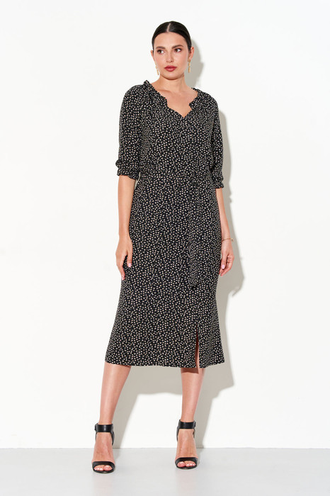 Женское летнее платье полуприлегающего силуэта выполнено из натурального полотна в приятном цветочном принте. Платье на запах с потайной кнопкой в области груди, отрезное по линии талии. По горловине и низу рукавов вставлены резинки, создающие сборки. В боковом шве платья - застежка-молния, в боковых швах - функциональные карманы, по линии талии - пояс-завязка, по низу - волан с разрезами.