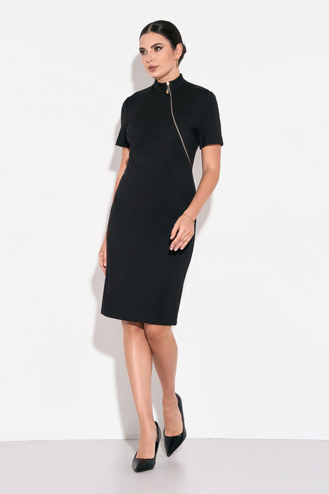 Женское классическое черное платье полуприлегающего силуэта со втачными рукавами из мягкого высококачественного трикотажа с содержанием вискозы. По переду изделия функциональная молния , переходящая в воротник-стойку, по спинке - вытачки и разрез. При правильном уходе ткань не скатывается и не деформируется. Уход: - стирка при температуре не более 30 градусов, предпочтительно ручная или деликатный режим стиральной машины;