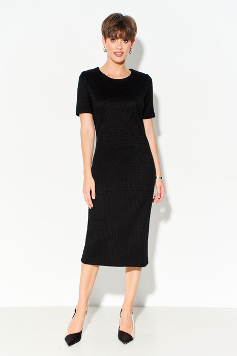 Женское базовое платье со втачными рукавами прилегающего силуэта выполнено из высококачественного трикотажного полотна "в косичку". Вырез горловины круглой формы, по спинке застежка на молнию, внизу шлица. Платье полностью соответствует заявленному размеру. Пожалуйста, пользуйтесть таблицей обмеров готового изделия.