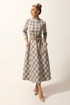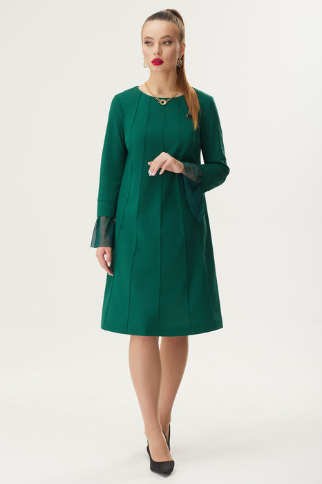 Платье женское прямого силуэта, зауженное к низу, отрезное по талии, с округлым вырезом горловины и втачными рукавами. Полочка оформлена застроченым складками и пришивным украшением. Баска и рукава выполнены из красивого гипюра в цвет основной ткани.