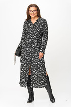 Платье женское полуприлегающего силуэта из тонкого джинса, длиной до середины колена. Свойства ткани позволяют расположить на изделии детали чётких форм: паты(по плечевому шву), декоратные клапаны(на нижней части переда), а также расположить втачную декоративную молнию в верхней части переда. Рукав платья короткий втачной, по центру переда-потайная застежка на петли и пуговицы, горловина оформлена воротником-стойкой, борт образует отложные лацканы. Клапаны и паты украшены металлическими пуговицами. Платье дополняют съёмный пояс и декоративные строчки