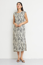 Платье женское прямого силуэта выполнено из льняной ткани с добавлением вискозы. Горловина круглая с застежкой на спинке на пуговицу. Рукав фантазийной формы. На центральной детали переда расположена вышивка в народном стиле. На талии настрочены короткие кулиски по центру спинки и переда, в которые продет декоративный шнур. В боковых швах по низу имеются разрезы по обеим сторонам.
