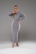 Платье женское трикотажное, полуприлегающего силуэта.По переду рельефе обработан разрез. Спинка с рельефами идущими от плеча и выточками по линии талии. Горловина лодочка. Рукав 3/4 со спущенной линией плеча.