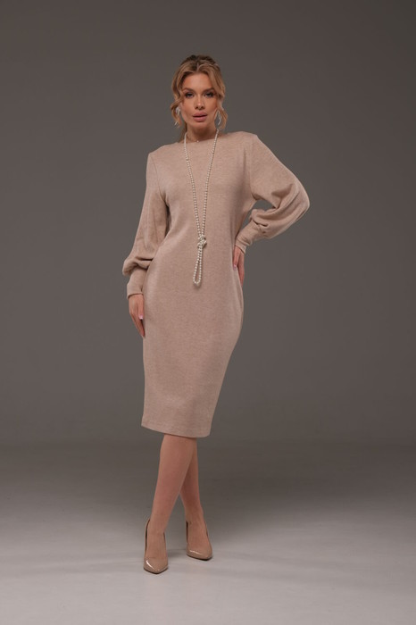 Платье женское прилегающего силуэта из трикотажной ткани.По переду горловина лодочкой. Спинка со средним швом, заканчивающаяся разрезом.