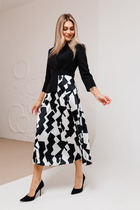 Платье женское слегка расклешённое к низу, льняное. На переде расположена декоративная печать. Нагрудная вытачка идёт с боковых швов. На правой половине расположен накладной карман. Спинка со средним швом, в котором расположена застёжка горловины на одну пуговицу. Горловина круглой формы. По боковым швам имеются разрезы. Рукава короткие, одношовные.