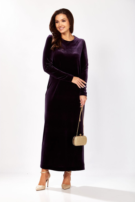 Платье прямого силуэта из бархата.  В боковом шве разрез. Рукав втачной одношовный. По спинке застежка капелька на петлю и пуговицу.  Длина  платья - 136 см, длина рукава -  66 см.