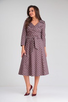 Платье прямого силуэта из плотного трикотажного полотна. Перед с нагрудными вытачками. Спинка со средним швом. Горловина лодочкой обработана планкой. Рукав одношовный втачной по низу со складками собранными на манжету-довяз. Длина платья-100см, длина рукава-60см.