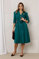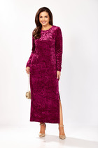 Платье прямого силуэта из плотного трикотажного полотна с рисунком и с люрексом. Перед с нагрудными вытачками. Спинка со средним швом. Горловина лодочкой обработана планкой. Рукав одношовный втачной по низу со складками собранными на манжету. Длина платья-100см, длина рукава-60см.