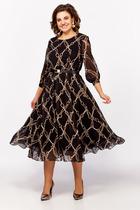 Платье, с застежкой на потайную молнию в среднем шве спинки, без воротника, с круглым вырезом горловины. Платье отрезное по линии талии. Лиф переда частично присборен по талиевому шву. По центру лифа переда настрочена деталь из кружева. Лиф спинки со средним швом, талиевыми вытачками. Нижняя часть переда платья со средним швом, втачными деталями из кружева. Нижняя часть спинки со средним швом, талиевыми вытачками. Рукав втачной, короткий, с отрезной манжетой. Окат и низ рукава присборен.