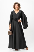 Платье без воротника, без рукавов, на бретелях, с фигурным вырезом горловины, с застежкой на потайную молнию в среднем шве спинки. Платье с отрезным лифом переда. По лифу переда – средний шов с кулисой и шнуром- завязкой. Нижняя часть платья с талиевыми вытачками. Спинка со средним швом, талиевыми вытачками. Бретели с воланами из кружева в цвет основной ткани.