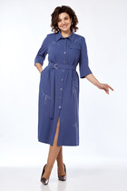 Платье, с центральной двубортной застежкой на пришивные кнопки, с отложным воротником и лацканами. Верхняя часть переда с нагрудными вытачками. Верхняя часть спинки со средним швом и талиевыми вытачками .Нижняя часть переда и спинки расклешенная. Низ переда закладывается в односторонние складки. Шов по талии присборен на резинку. Рукав втачной, короткий, с отложной манжетой. Платье со съемным поясом.